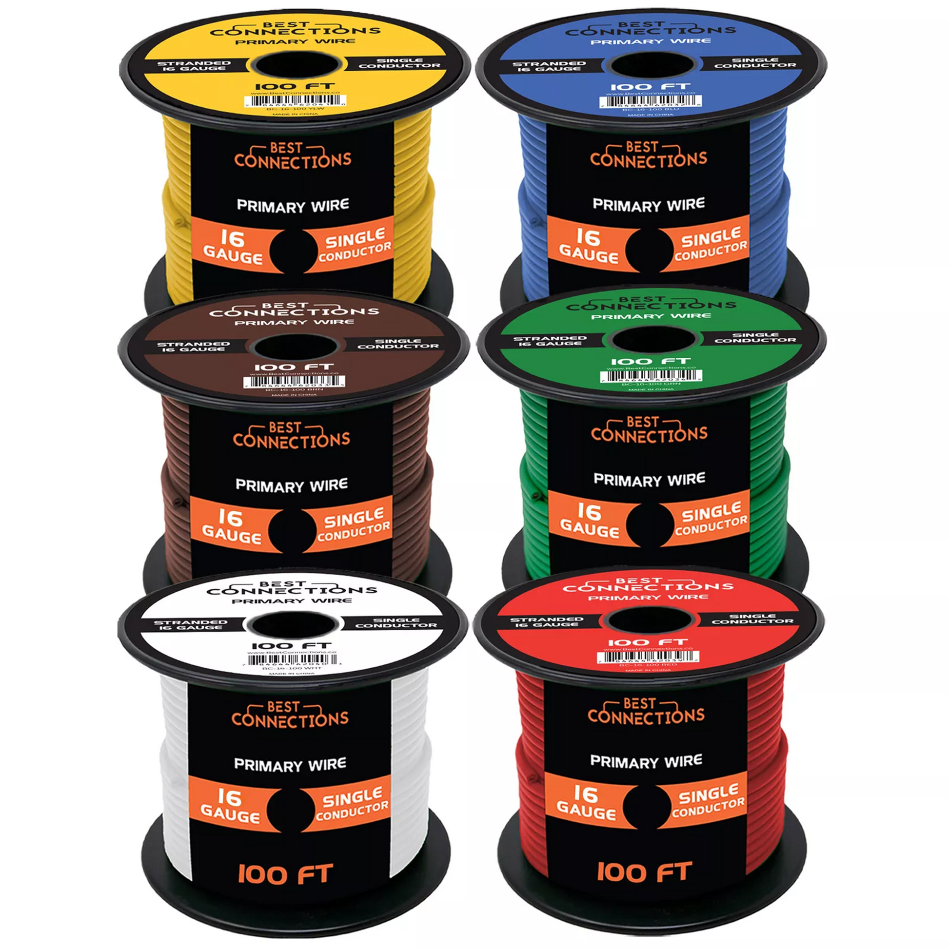 6 WIRES, 6 COLORS & 100ft PER ROLL - This convenient roll offers a generous 100ft length of wire, comprising Six individual wires in Six distinct colors. Each wire is a single conductor, providing flexibility for various applications such as primary, remote, turn on, hook-up, or ground wire purposes.