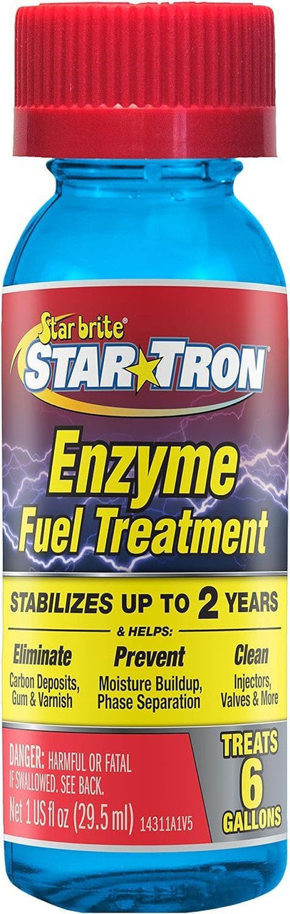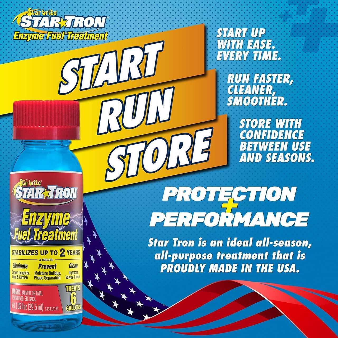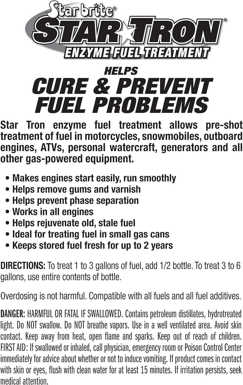 StarTron Enzyme Fuel Treatment is a multifunctional fuel additive which uses a unique enzyme technology that allows all engines to start easily and run smoothly, even when using ethanol-blended fuel or after sitting idle for months. StarTron allows fuel to burn more completely, which results in maximum performance, fuel efficiency and reliable operation. StarTron will stabilize fuel for up to two years, preventing the formation of gums and other solids that clog carburetors and fuel injectors. StarTron helps prevent phase separation by dispersing water throughout fuel as submicron-sized droplets that can be safely eliminated while the engine operates. StarTron Small Engine formula is ideal for use in all gas engines including; boats, cars, trucks, motorcycles, small equipment as well as engines that use pre-mix fuel.