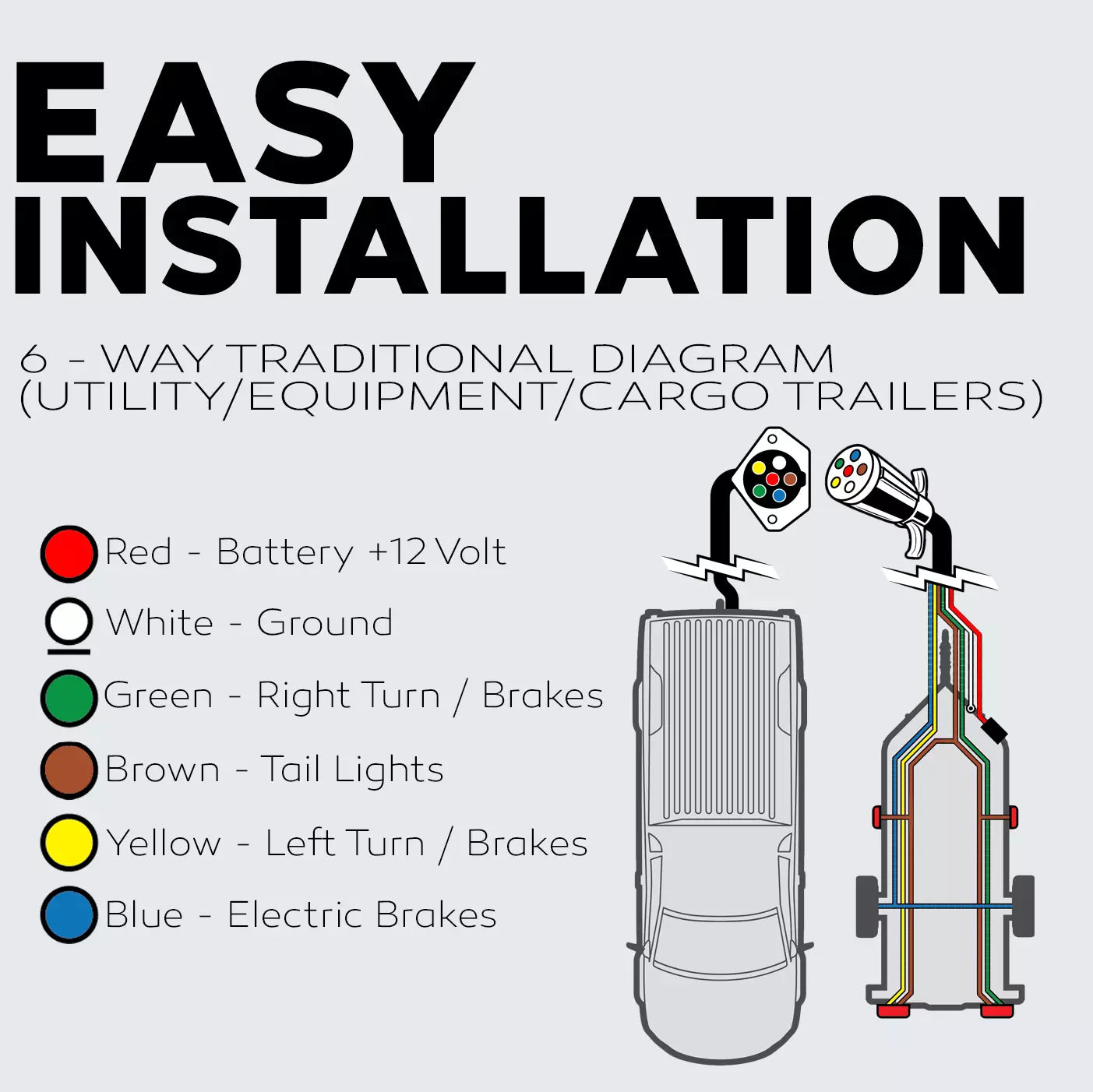 EFFORTLESS INSTALLATION WITH COLOR-CODED WIRES - Simplify Your Trailer's Electrical Setup With Our 6-Way Trailer Wire, Featuring Seven Color-Coded Wires (Red, Blue, Green, Brown, Yellow, White). Easily Connect Your Trailer Lights, Brakes, Reverse, Turn Signals, Auxiliary Power, And Other Essential Components. The Intuitive Color-Coding System Allows For Quick Identification And Hassle-Free Installation, Even For Those With Limited Experience.