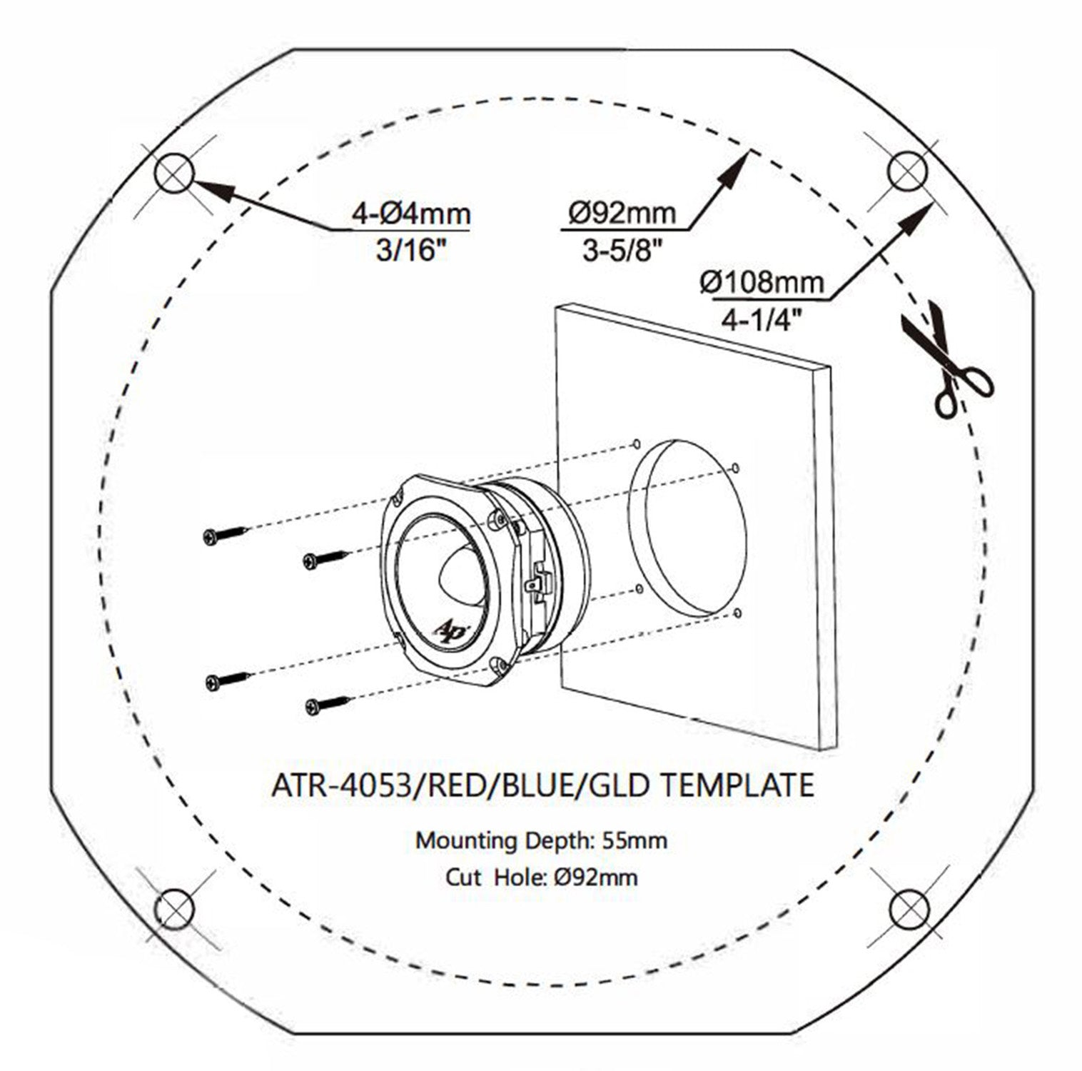 - Front Mount Baffle Cutout: (Cut Hole) 3.6" / 92mm