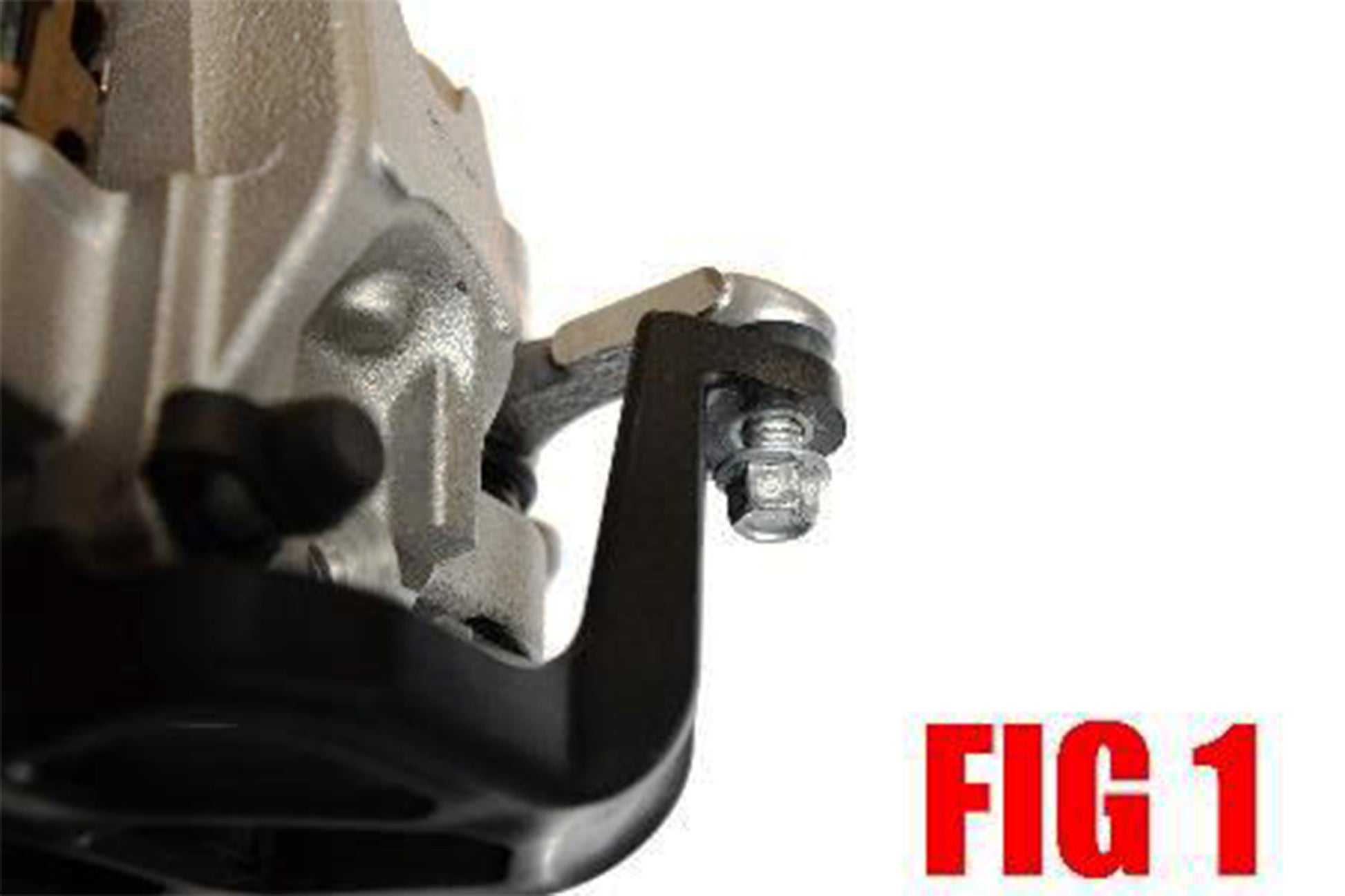 10. Install brake pad stop clip. NOTE: The brake pad stop clip has two tabs on the sides that go over the edges of the cut away for the front of the brake pads that hold it in place. If yours does not snap in place, it will be necessary to slightly bend the two tabs inward until the stop has a tight fit over the edges of the brake caliper carrier. (FIG 7)