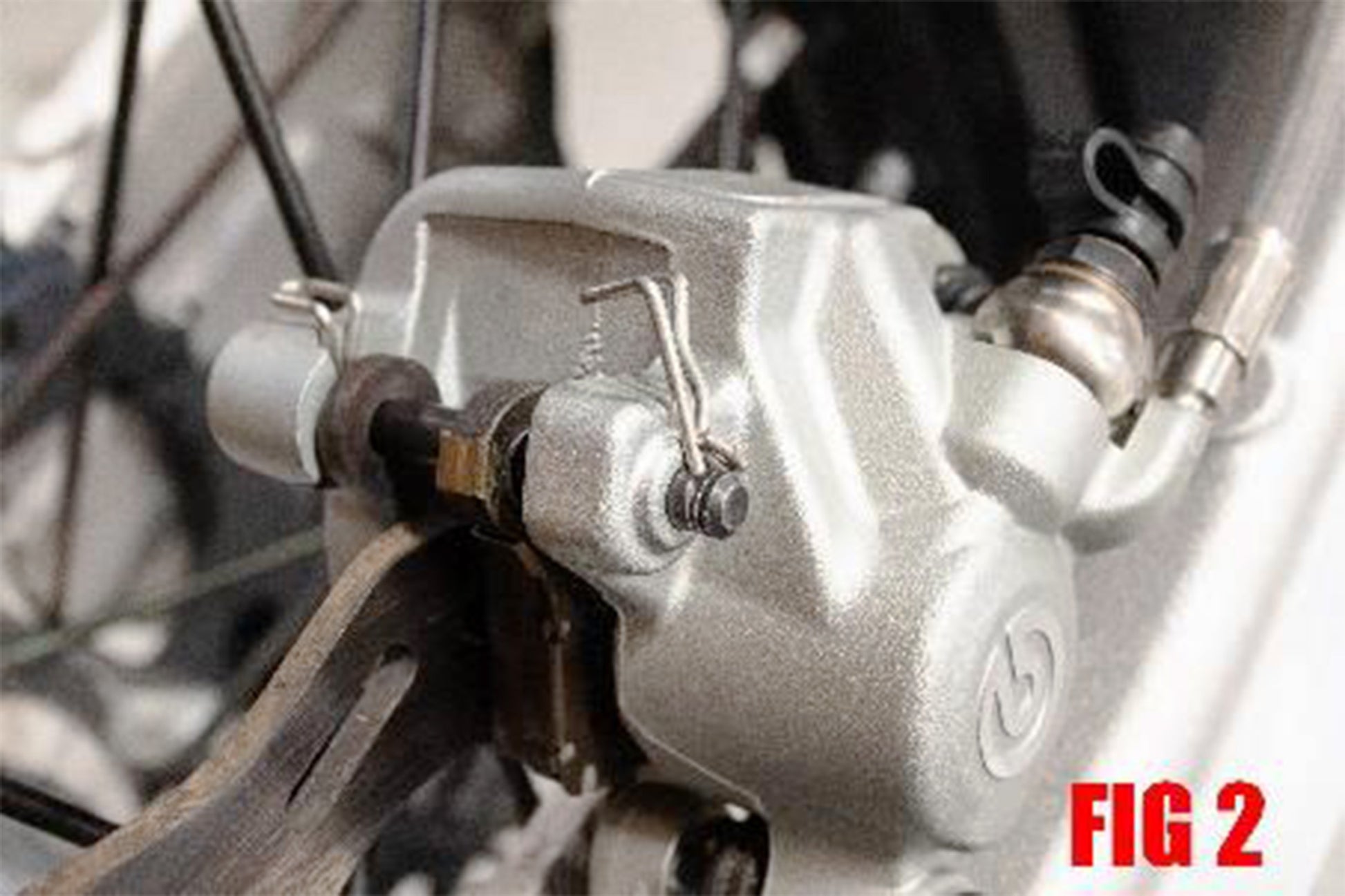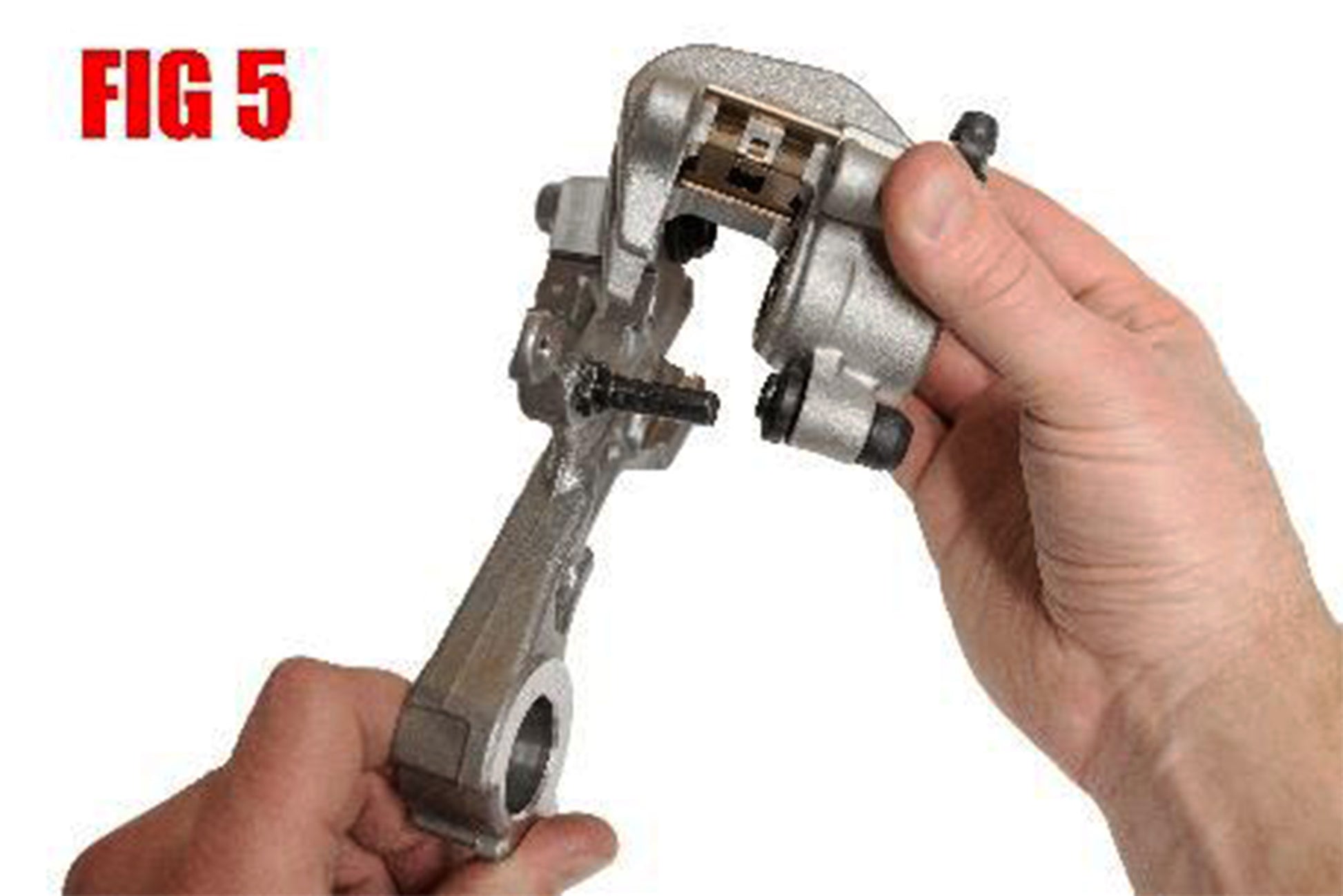 6. Slide caliper carrier (with caliper still mounted on it) off of the swingarm tab. Now remove caliper from carrier by sliding it off of the caliper slide pins. (FIG 5)