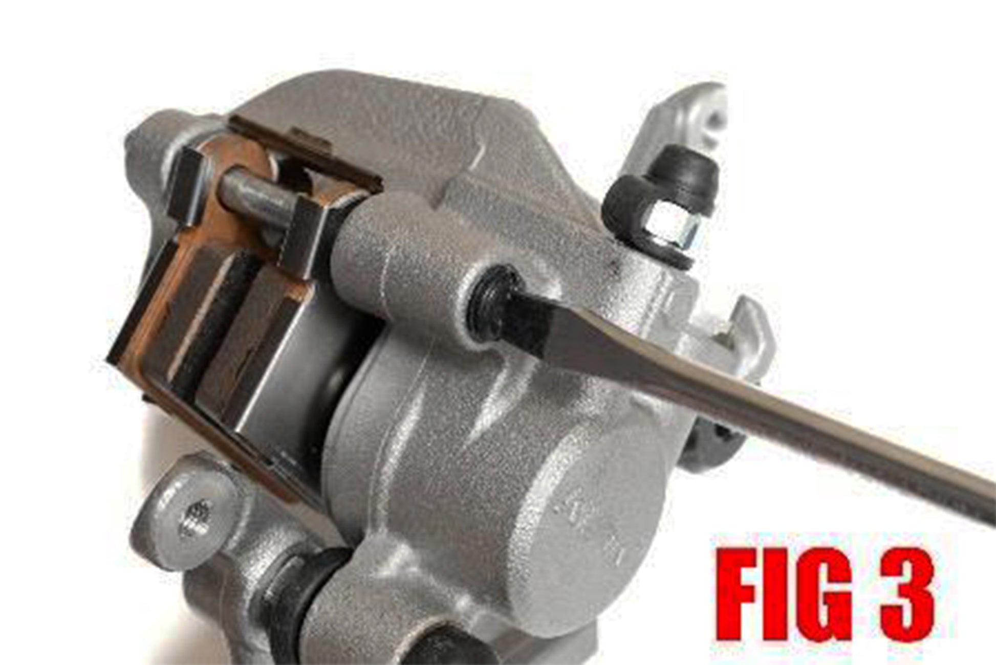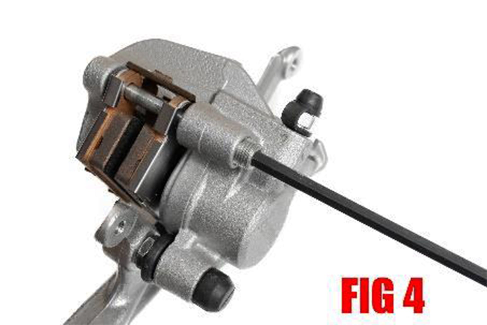 3. For calipers with a clip style stay on the brake pad pin. Remove the pin or pins from the brake pad pin and slide the brake pad pin out. (FIG 2) For Calipers with a threaded brake pad pin, using a flat blade screwdriver, remove the plug. (FIG 3) Using a 5mm allen wrench or 8mm socket depending on your model, remove the brake pad pin. (FIG 4)
