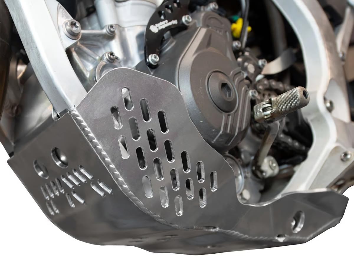 Enduro Engineering's Skid Plate for the Triumph TF 250-X is specifically designed to protect vulnerable engine cases, covers and frame rails from the elements without being bulky. They're the leading factor to extreme protection is due to the CNC-machined 5052H32 aluminum alloy construction which leads to an outstanding strength to weight ratio.