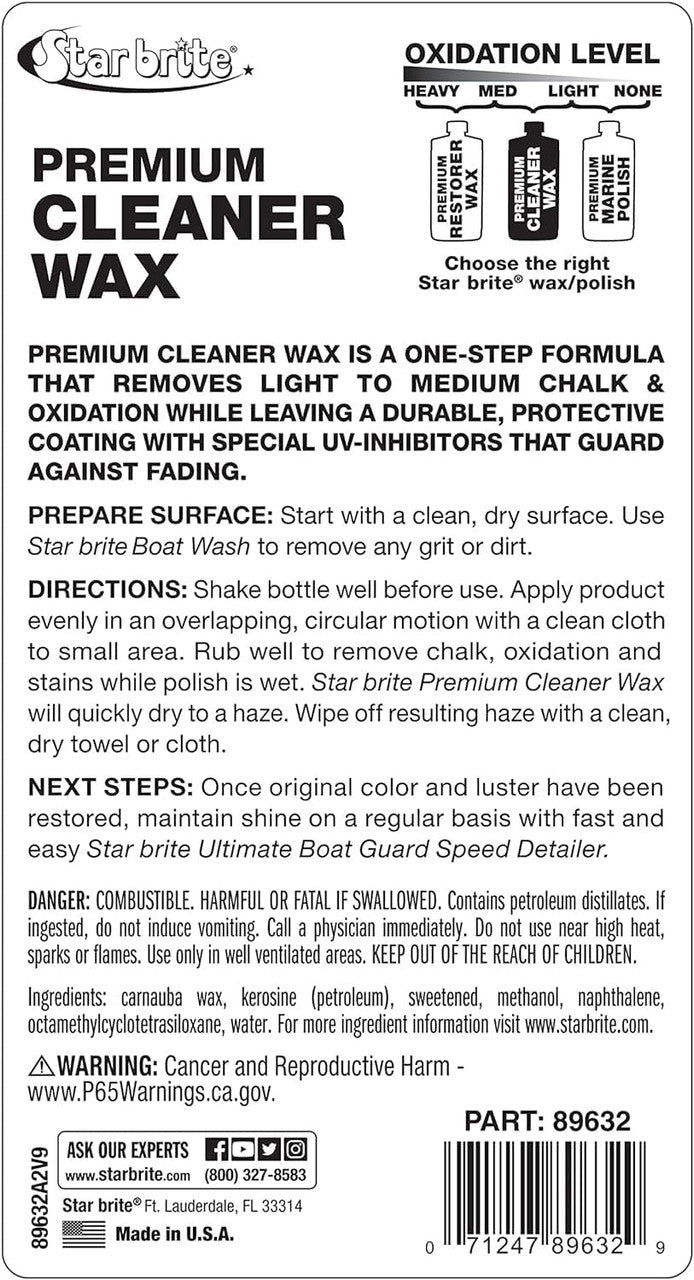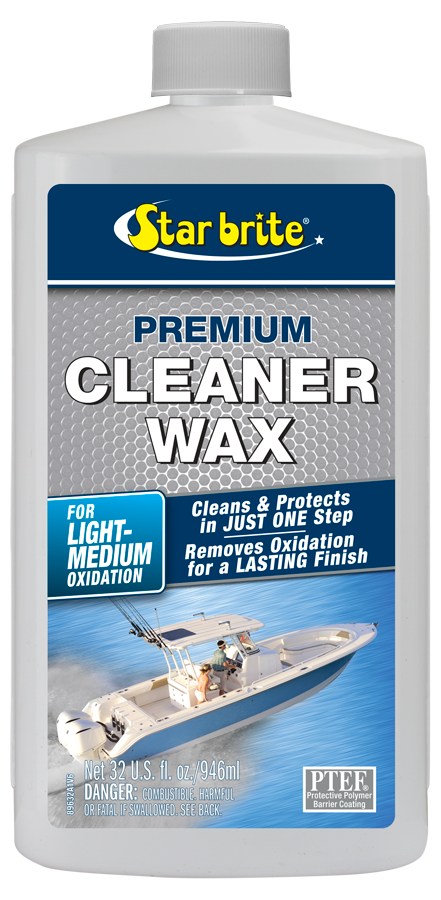 Starbrite Premium One Step Heavy Duty Cleaner Wax with PTEF will quickly dry to a haze. Wipe off resulting haze with a clean, dry towel or cloth. Because fiberglass surfaces are porous, additional oxidation may leach out after 10-20 days, requiring a repeat application of Cleaner Wax. Once gelcoat is restored, follow up with Premium Marine Polish with PTEF for long lasting protection.